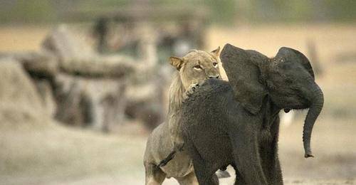 虽然年幼,但战绩颇丰富的狮子聪明地选择从后面袭击猎物。一开始就用爪子死死地扣住小象背部,深入肉里,小象痛得步伐大乱,毫无还手之力。